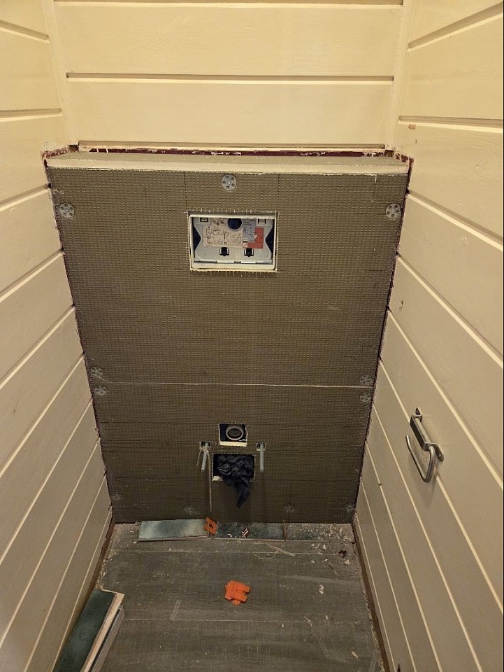 Achter het toilet: Het wordt sterk aanbevolen om in ieder geval de muur achter en rondom het hangtoilet te betegelen, met name onder de toiletflens.